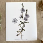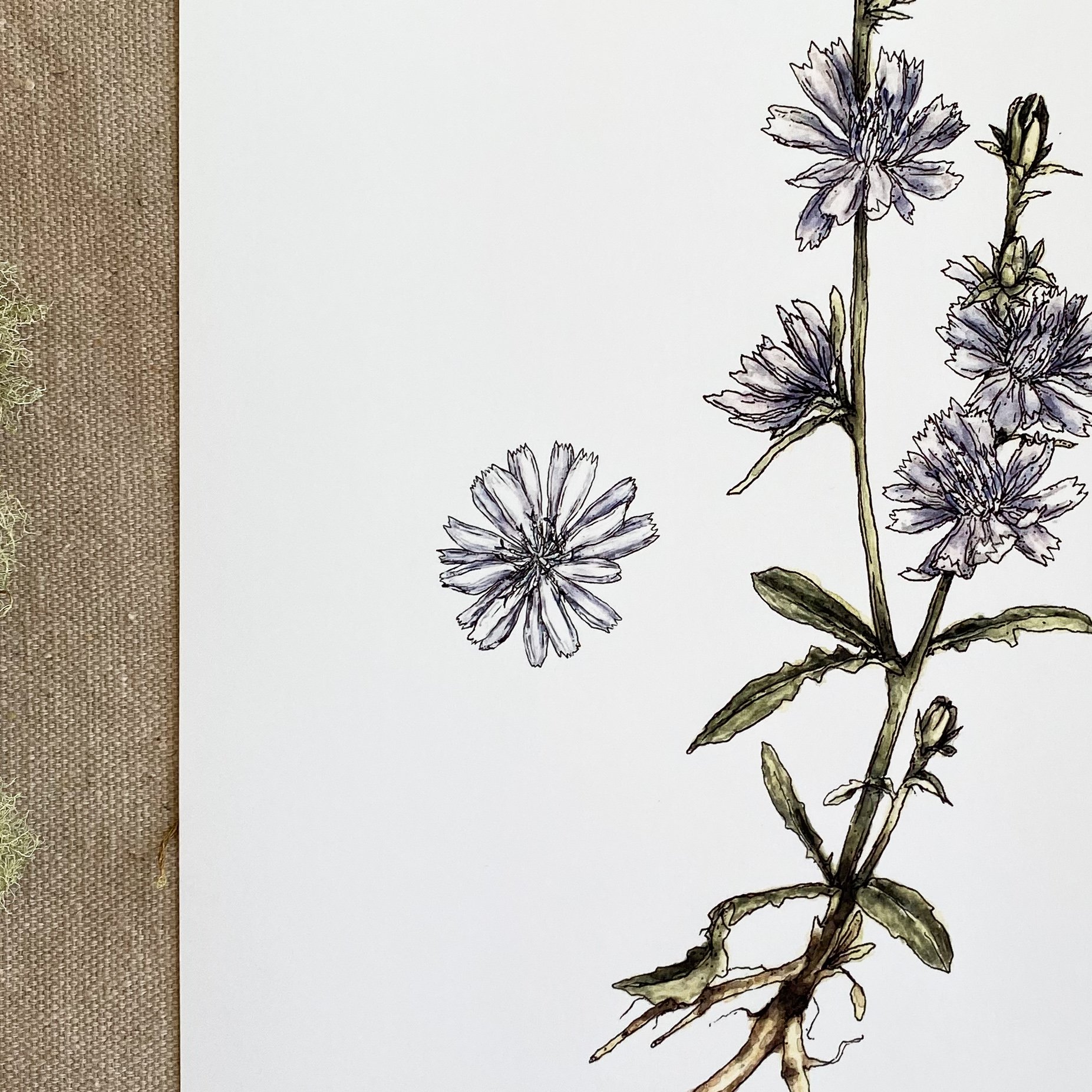 print design featuring a wild chicory plant plucked from the ground showing off their beautiful root system. archival print on white paper sized at various size options. high quality reproduction of original watercolor painting.