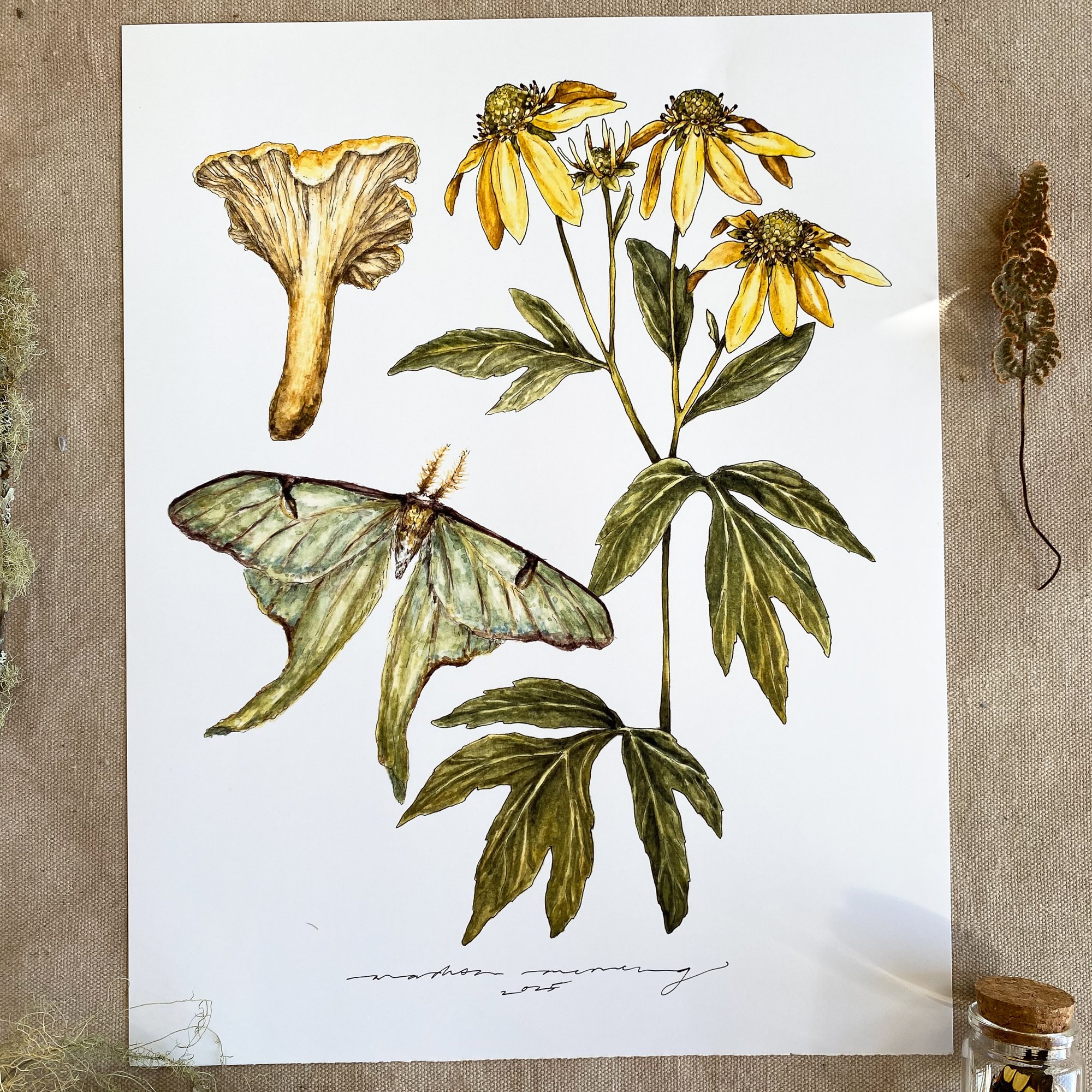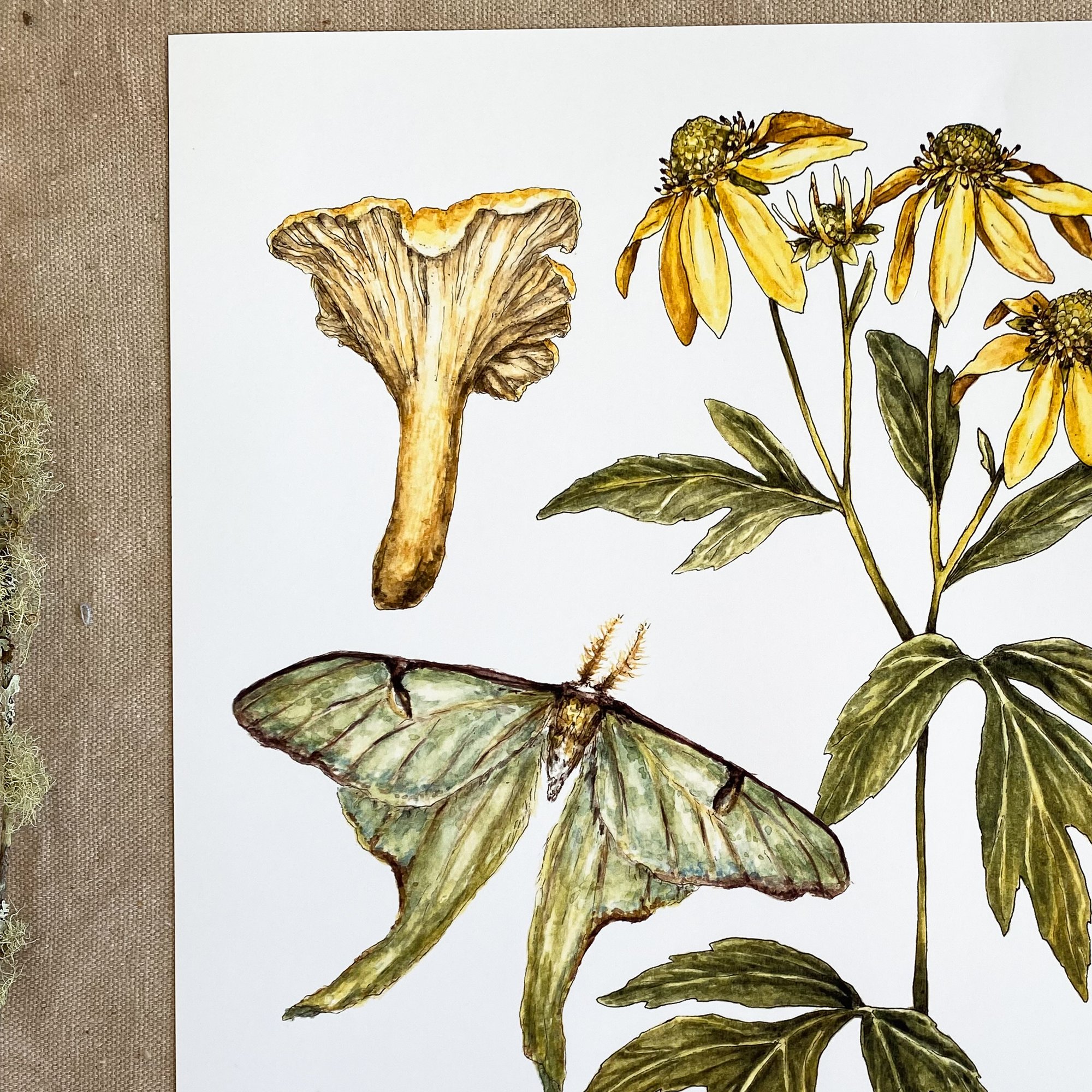 print design featuring some earth beings I dream of when I think of June in Michigan: sochan plants growing tall and blooming flowers, luna moths resting among trees, & chanterelle mushrooms on the forest floor. archival print on white paper sized at various size options. high quality reproduction of original watercolor painting.