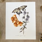 a scene of fleeting summer including a tiger swallowtail butterfly, chicory flowers, & chicken of the woods mushroom painted in earthly watercolor pigments. printed on a white card-stock & sized in two variant options: 8x10" & 12x18".