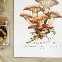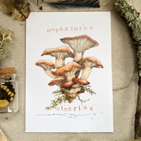 omphalotus olearius mushroom painted with earthly watercolor pigments. mushroom is also known as the jack o’ lantern. this mushroom gets it’s nickname by producing a chemical to make it appear to glow a bright blue-green color in the night. it is poisonous to eat. printed on a durable, white paper stock sized at 5x7".