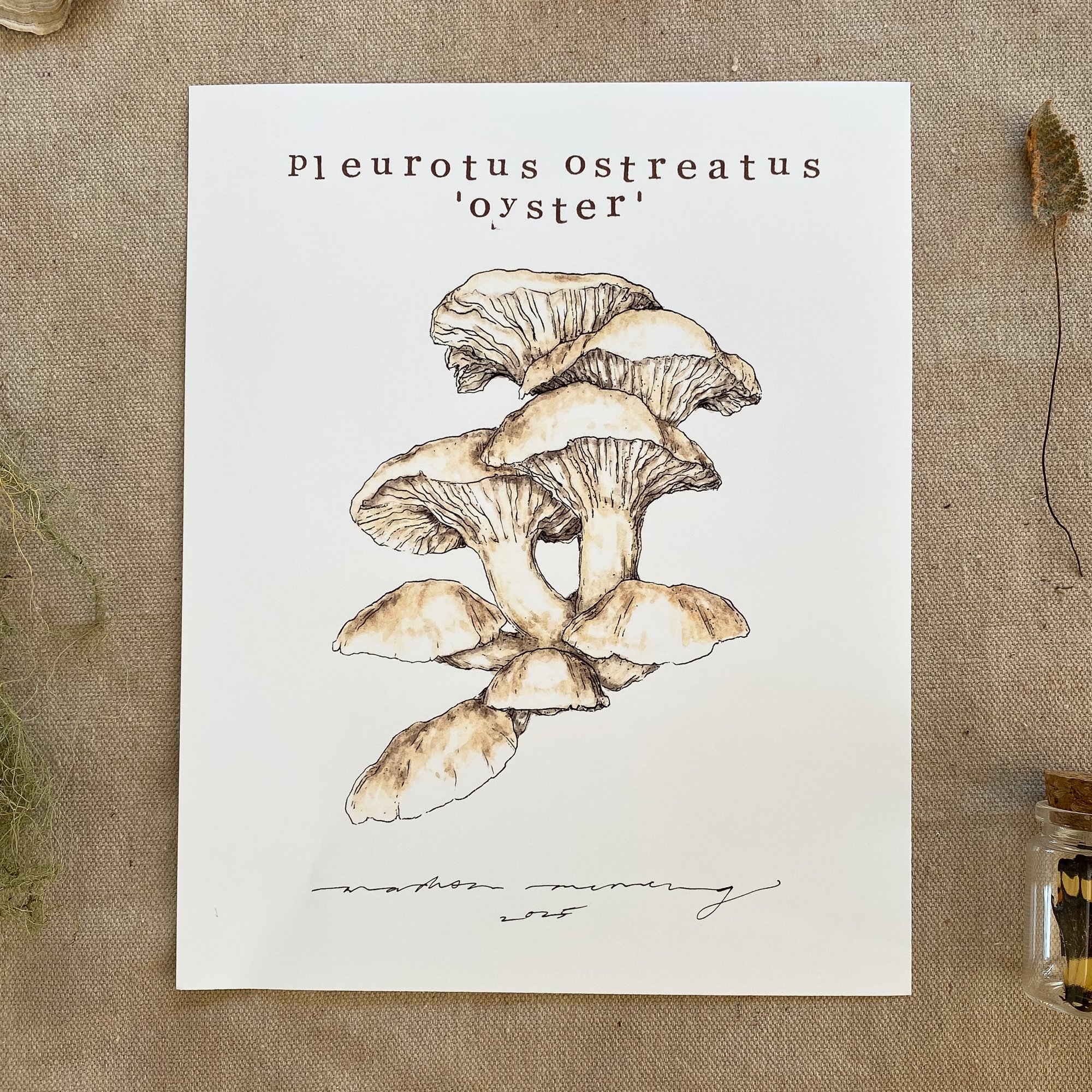 pleurotus ostreatus 'oyster' mushroom painted in earthly watercolor pigments. printed on a white card-stock & cut to 8x10".