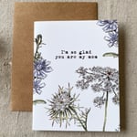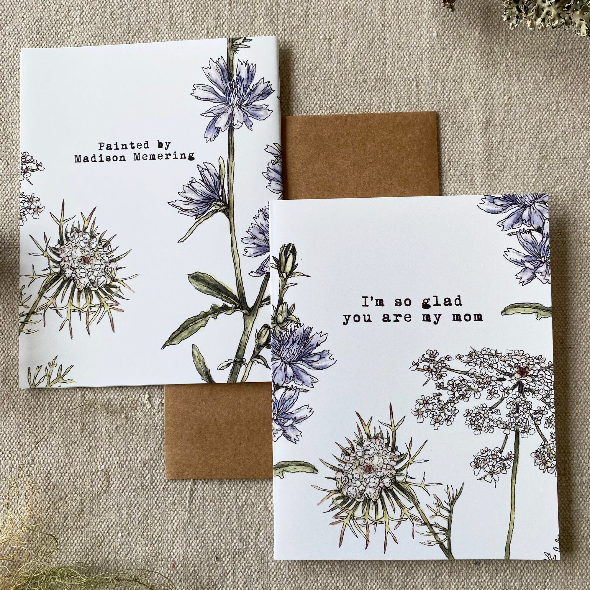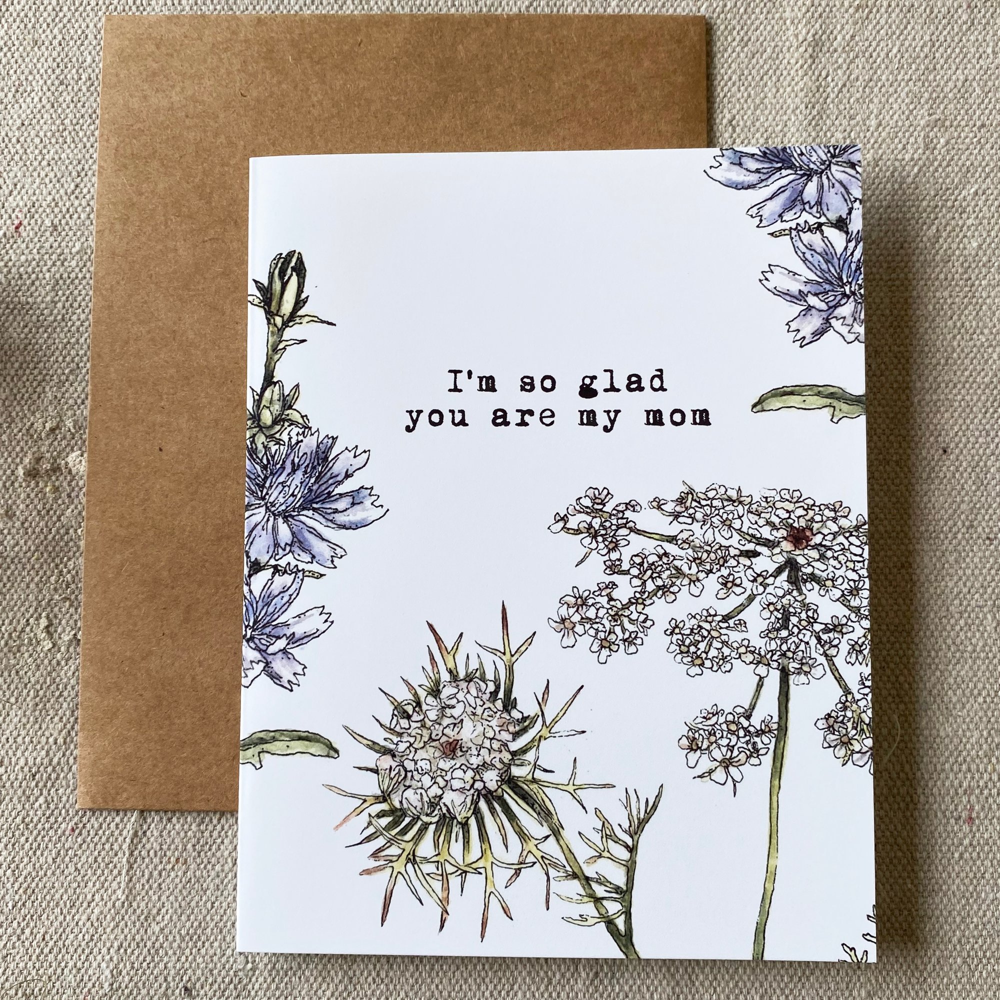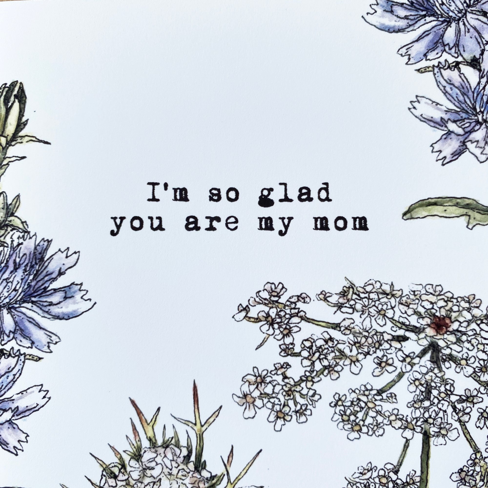 greeting card featuring a unique design of wild carrot & chicory flowers wrapping around the front panel stretching to the backside. card reads "I'm so glad you are my mom."