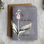 greeting card featuring a pink lady slipper orchid wrapping around the front panel & a queen anne's lace flower on the back. card reads "to my lady..."