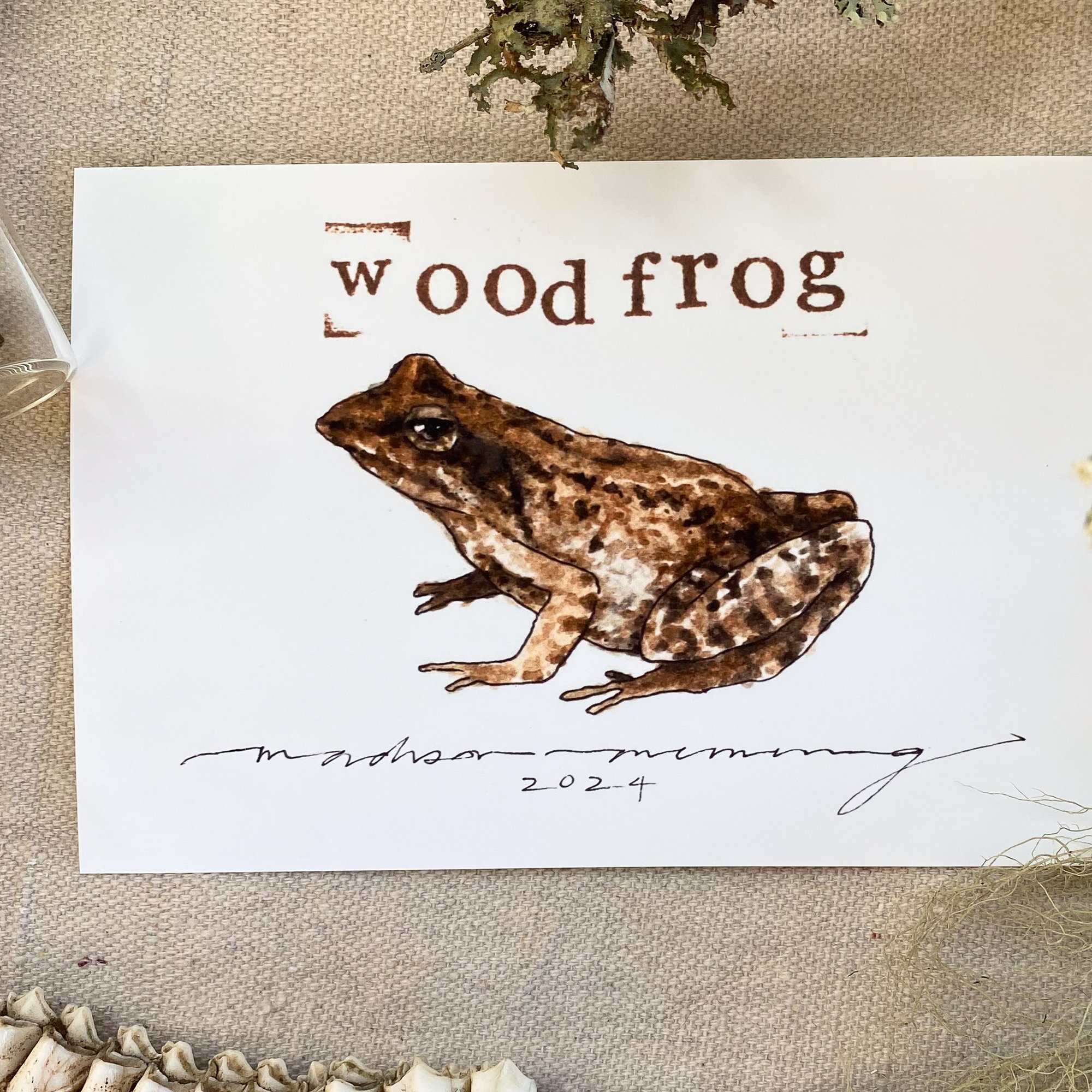 5x7" print of a wood frog painted in watercolor pigments. print is on a white card-stock paper.