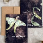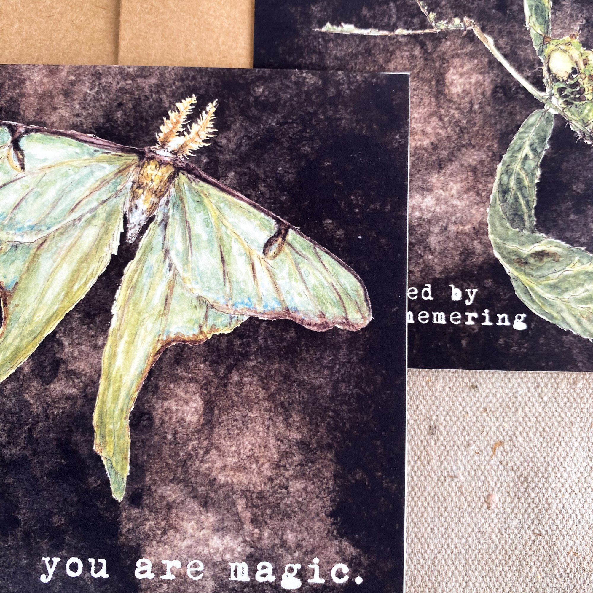 greeting card featuring a luna moth with a unique design wrapping around the front panel stretching to the backside. the back panel shows the luna moth caterpillar on it's host plant: black walnut leaves. card reads "you are magic."